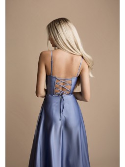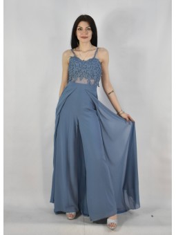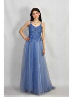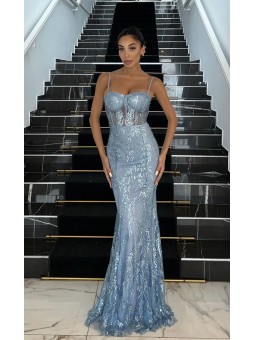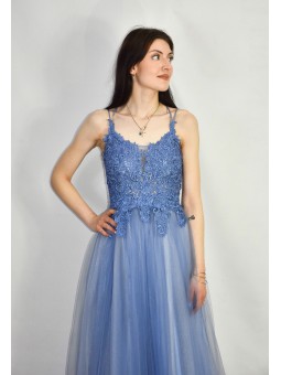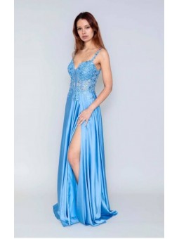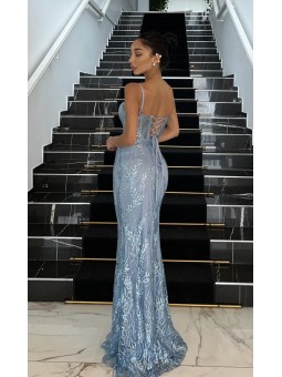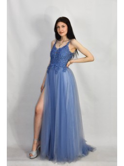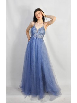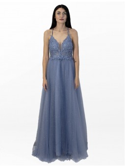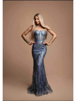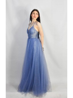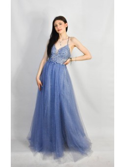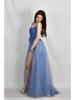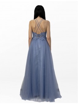 abito impero con corpetto a cuore, bustino velato e gonna con spacco in tulle brillantinata