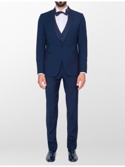 Abito tipo smoking con petto raso sciallato lucido  un bottone con tasche a friso rivestite e bottoni ricoperti in raso vestibilità slim drop/7