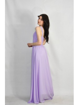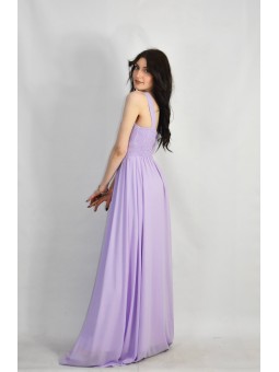 Abito impero con corpetto ricamato, scollo a V (petto/schiena) con manica lunga velata e ricamata e spacco laterale inguinale (lato sinistro)
