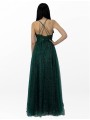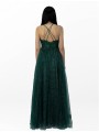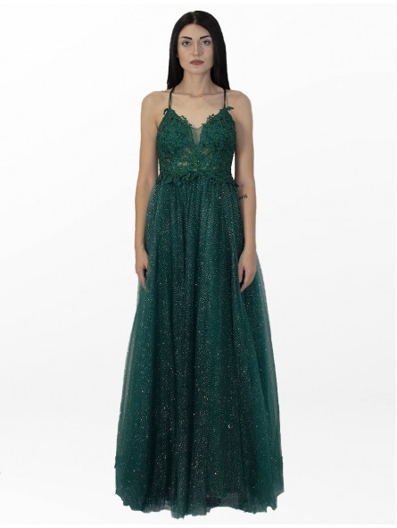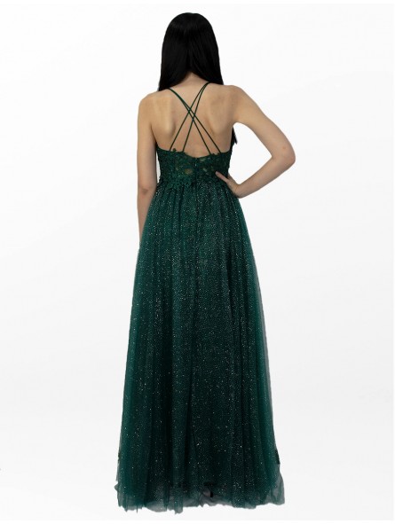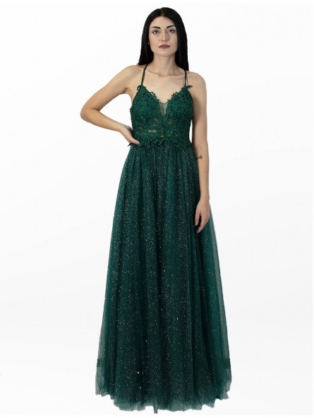 abito impero brillantinato con corpetto ricamato scollo a V e incrocio di laccetti sulla schiena
