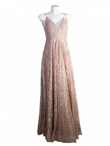 abito lungo glitterato con corpetto ricamato e spacco laterale