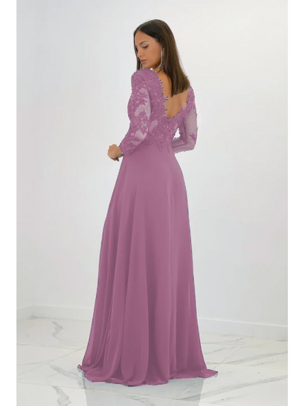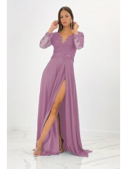 Abito impero con corpetto ricamato, scollo a V (petto/schiena) con manica lunga velata e ricamata e spacco laterale inguinale (lato sinistro)