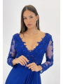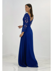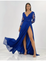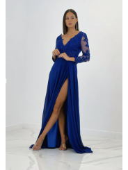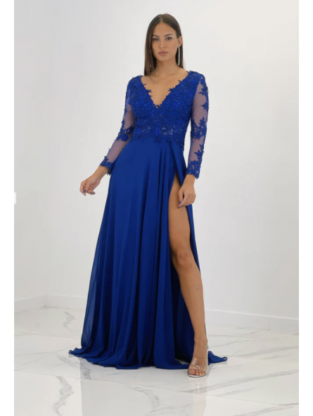 Abito impero con corpetto ricamato, scollo a V (petto/schiena) con manica lunga velata e ricamata e spacco laterale inguinale (lato sinistro)