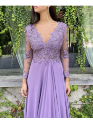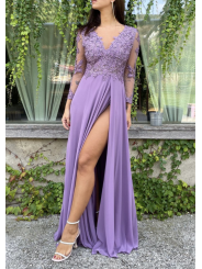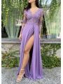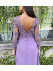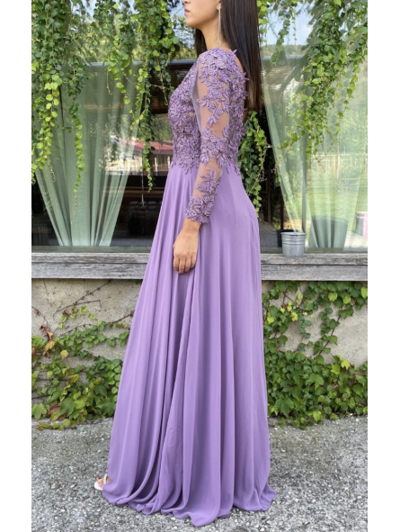Abito impero con corpetto ricamato, scollo a V (petto/schiena) con manica lunga velata e ricamata e spacco laterale inguinale (lato sinistro)