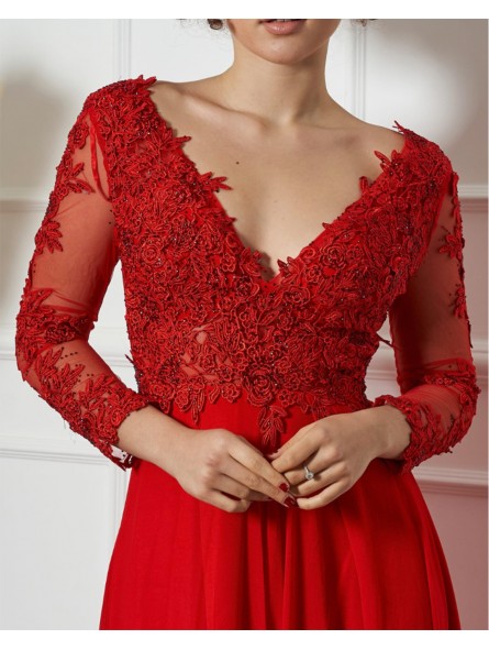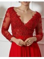 Abito impero con corpetto ricamato, scollo a V (petto/schiena) con manica lunga velata e ricamata e spacco laterale inguinale (lato sinistro)