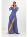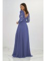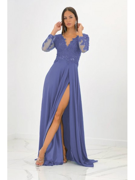 Abito impero con corpetto ricamato, scollo a V (petto/schiena) con manica lunga velata e ricamata e spacco laterale inguinale (lato sinistro)