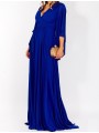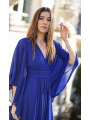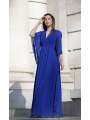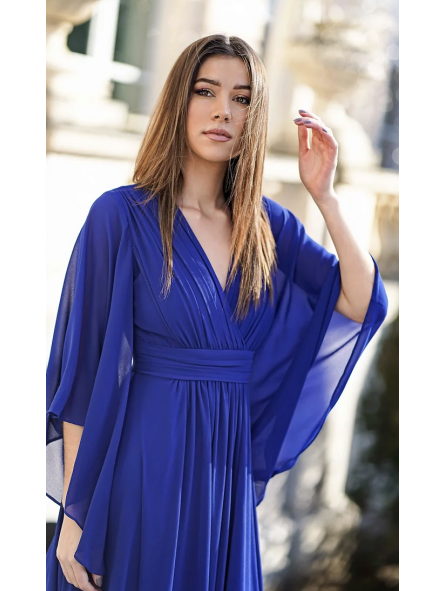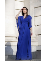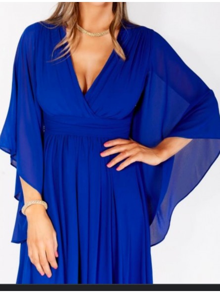 lungo abito da damigella d'onore con maniche a farfalla. È completamente foderato e ha coppe sul petto.