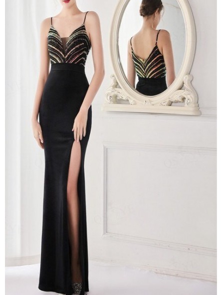 abito sirena in velluto con spacco laterale e corpetto con pailettes