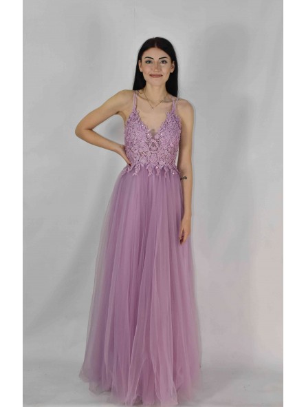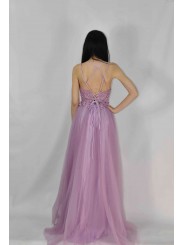abito impero in tulle con corpetto ricamato e spacco