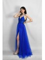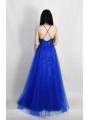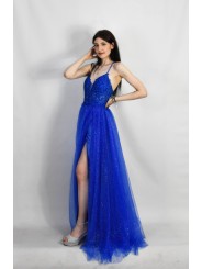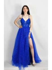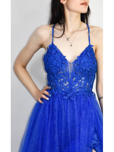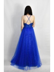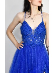 Abito in tulle glitterato e corpetto ricamato con scollo a V