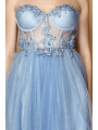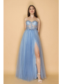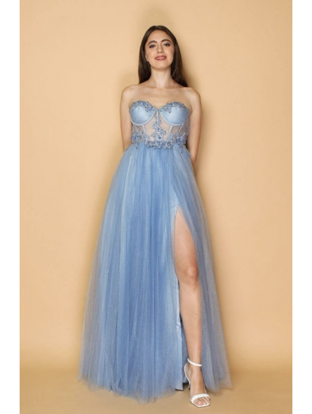 abito impero con corpetto a cuore, bustino velato e gonna con spacco in tulle brillantinata
