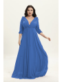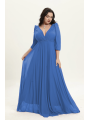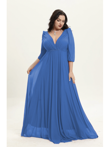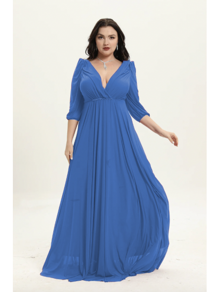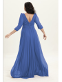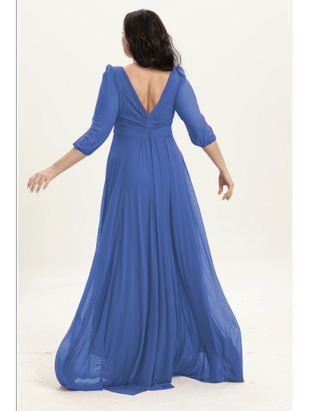 abito impero con spalline, scollo a V petto/schiena, manica 3/4 velata con elastico, linea di perline e brillantini sulla cinta, ampia gonna