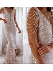 il non plus ultra delle sirene le paillettes sembrano formare le squame di una delle sirena che cercò di ammaliare Ulisse col suo canto. Grazie al tessuto elastico si adatta a qualsiasi corpo capace di renderlo unico e perfetto per tutte le forme anche le più Curvy, un mix di femminilità e sex appeal oltre ogni immaginazione, il tocco in più,i coralli in tinta cadenti a drappo sulle spalle riportandoci indietro di duemila anni ai tempi in cui le donne veniva venerate come Dee.L'abito da indossare per rendere qualsiasi evento unico da lasciare a bocca aperta uomini e donne...