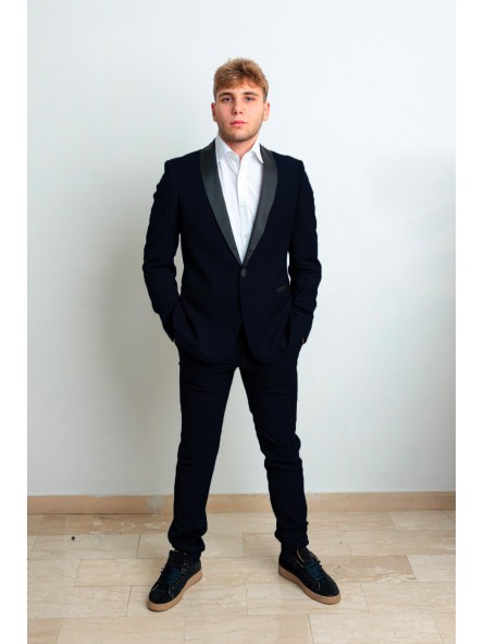 Abito tipo smoking con petto raso sciallato lucido  un bottone con tasche a friso rivestite e bottoni ricoperti in raso vestibilità slim drop/7