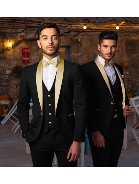 Abito tipo smoking con petto raso sciallato lucido  un bottone con tasche a friso rivestite e bottoni ricoperti in raso vestibilità slim drop/7