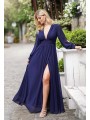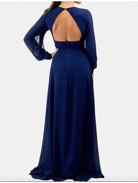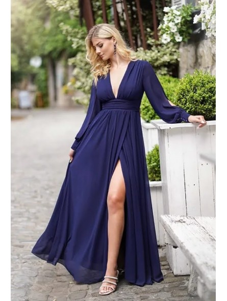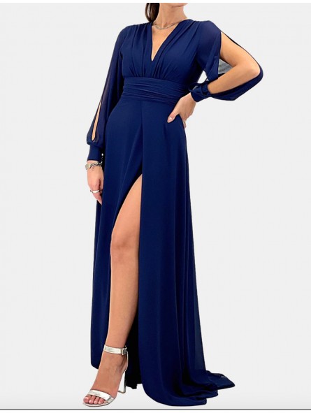 Abito con spacco morbido e velato scollo a V manica lunga velata trasparente con apertura centrale e vita fasciata