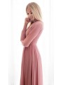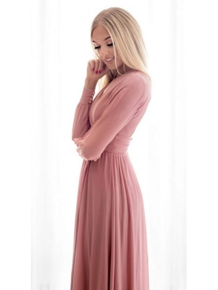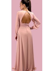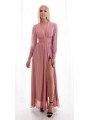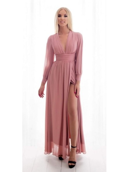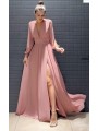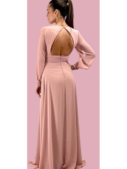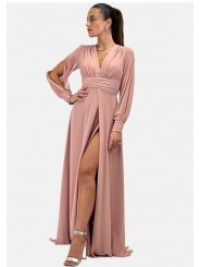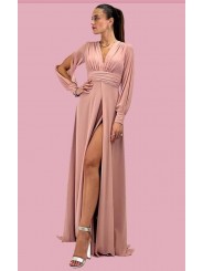 Abito con spacco morbido e velato scollo a V manica lunga velata trasparente con apertura centrale e vita fasciata