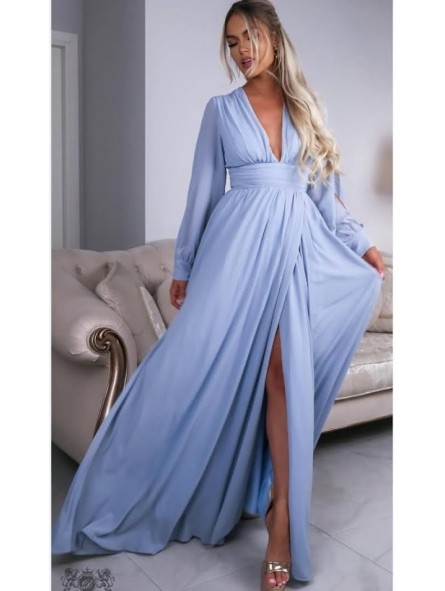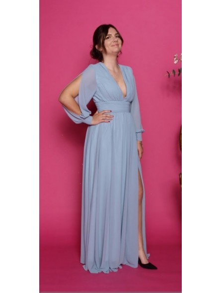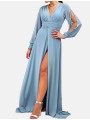 Abito con spacco morbido e velato scollo a V manica lunga velata trasparente con apertura centrale e vita fasciata