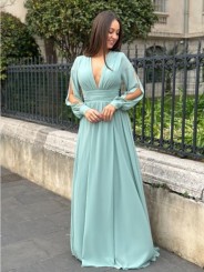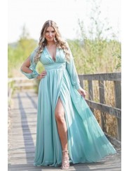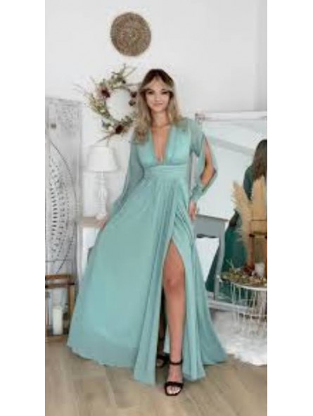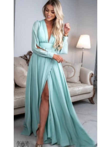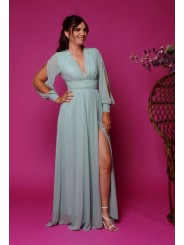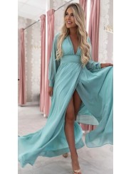Abito con spacco morbido e velato scollo a V manica lunga velata trasparente con apertura centrale e vita fasciata