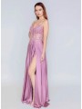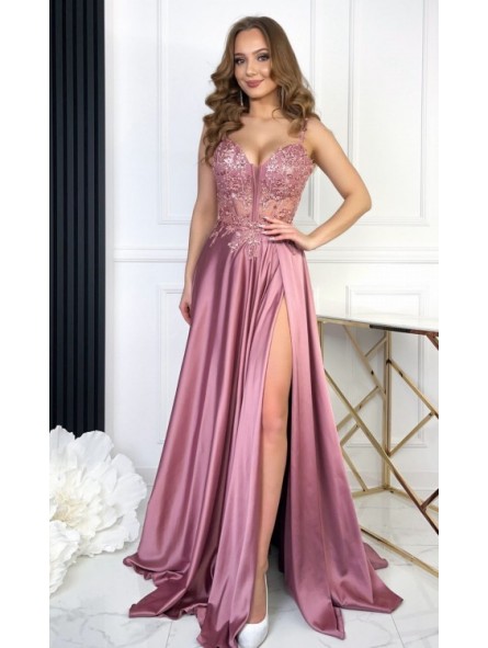 Abito in raso con spacco e corpetto con paillettes applicate.