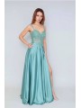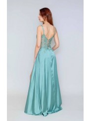 Elegante abito in leggero taffetà, perfetto per le occasioni più speciali. Il design raffinato con schiena scoperta e ricami in strass sul corpino aggiunge un tocco di lusso e femminilità irresistibile. Le coppe leggermente imbottite offrono un sostegno delicato, mentre i laccetti regolabili sulla schiena ti permettono di adattare l’abito alla perfezione per una vestibilità impeccabile. La cerniera posteriore garantisce una chiusura sicura e discreta, mentre lo spacco profondo sa dona un tocco di sensualità e audacia al tuo look