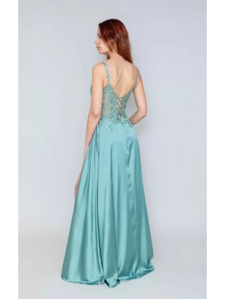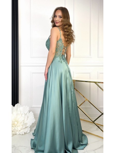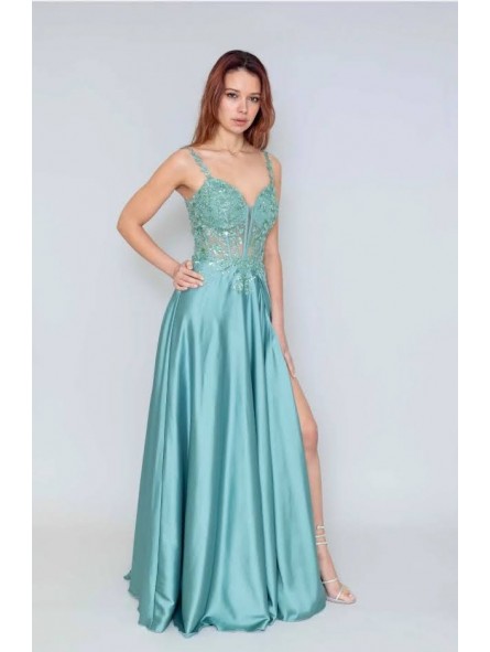 Abito in raso con spacco e corpetto con paillettes applicate.