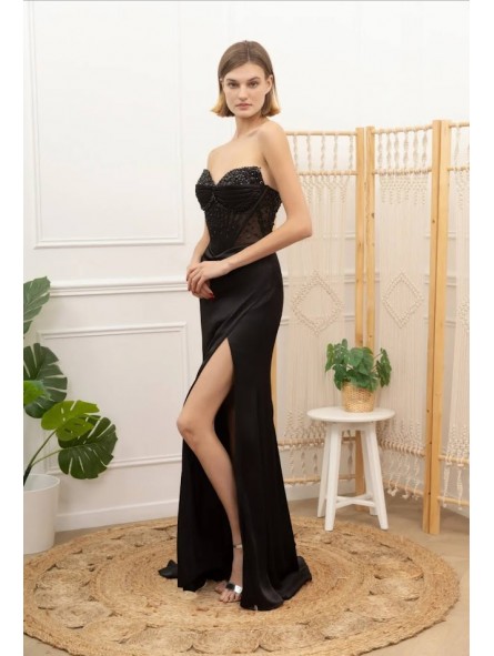 Uno spacco laterale garantisce il massimo comfort. Il tulle con paillettes cucito lateralmente aggiunge raffinatezza ed eleganza all'abito.