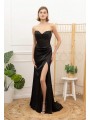 Uno splendido abito in raso leggero, dal taglio dritto, con uno spacco laterale, che avvolge magnificamente il corpo, mettendo in mostra e modellando la silhouette; le arricciature e i drappeggi sottolineano magnificamente le forme.