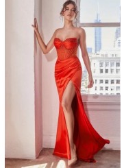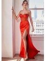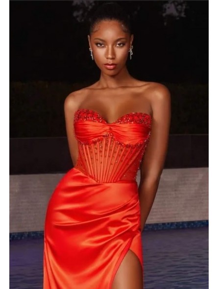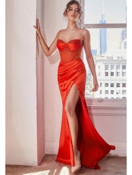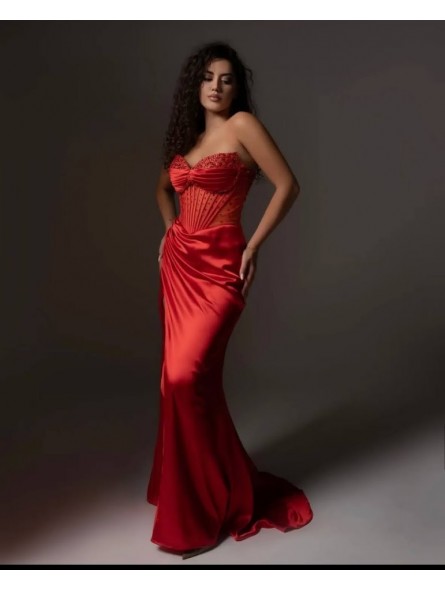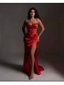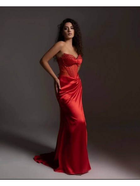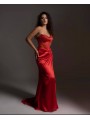 Uno splendido abito in raso leggero, dal taglio dritto, con uno spacco laterale, che avvolge magnificamente il corpo, mettendo in mostra e modellando la silhouette; le arricciature e i drappeggi sottolineano magnificamente le forme.