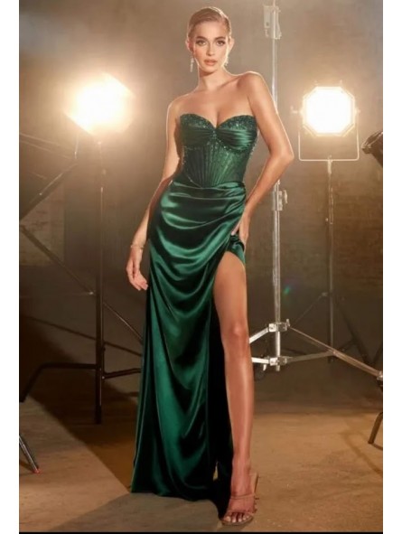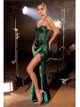 Uno splendido abito in raso leggero, dal taglio dritto, con uno spacco laterale, che avvolge magnificamente il corpo, mettendo in mostra e modellando la silhouette; le arricciature e i drappeggi sottolineano magnificamente le forme.
