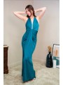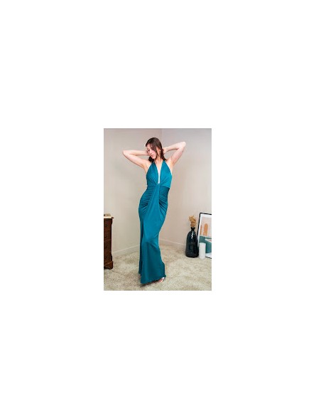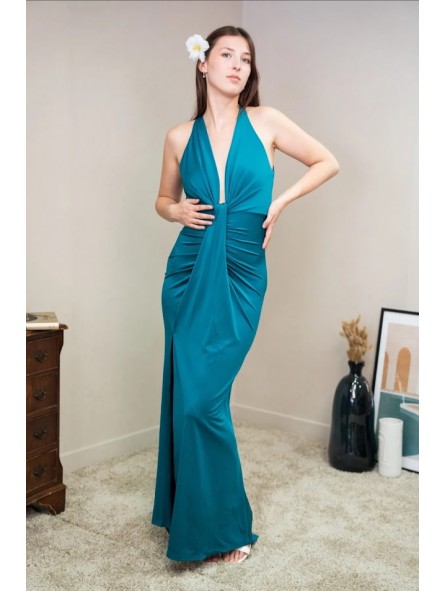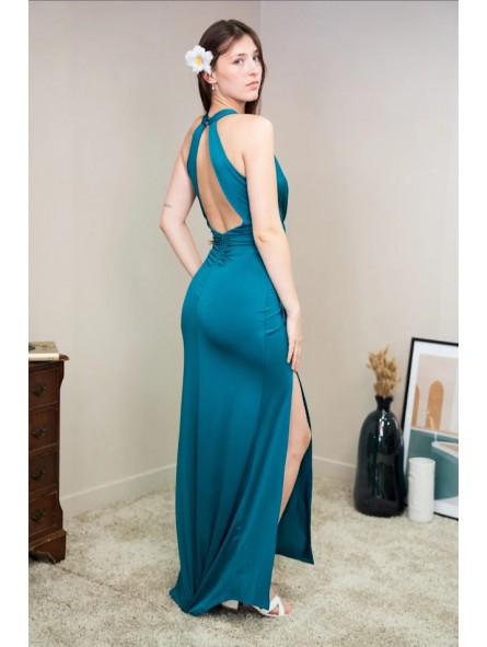 Abito da cocktail lungo e scollato con spacco, effetto sirena.