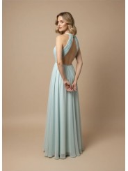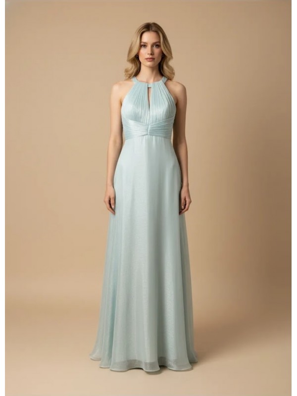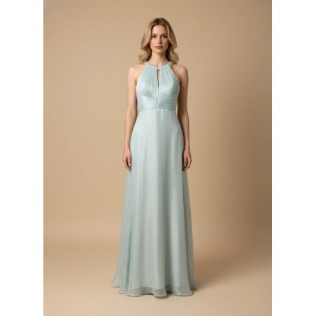 Elegante abito lungo dal taglio fluido, caratterizzato da scollo alto con apertura sul décolleté, corpetto delicatamente drappeggiato che sottolinea la vita e ampia schiena scoperta con spalline incrociate, che conferisce un tocco sofisticato e raffinato, ideale per le occasioni formali.