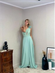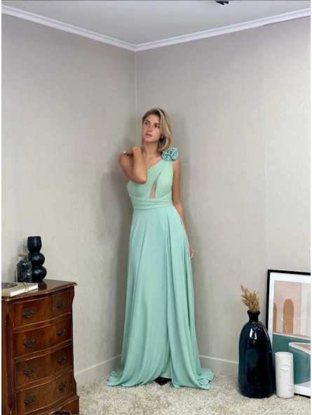 Abito lungo formale asimmetrico  con fiori staccabili e spacco