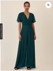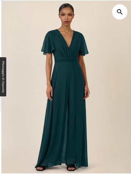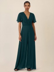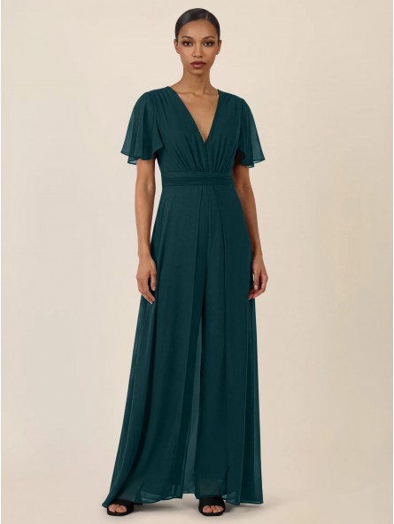 Questa elegante tuta è realizzata in chiffon leggero e svolazzante. Presenta uno scollo a V, maniche a volant e una sovrapposizione che dona volume. Il look è completato da pantaloni a gamba larga. Perfetta per eventi formali, questa tuta coniuga comfort e raffinatezza in modo impeccabile.