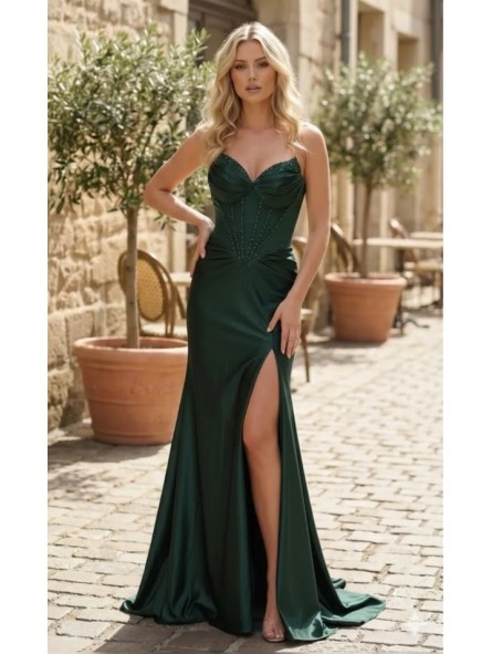 Vestito da cerimonia elegante e raffinato perfetto anche per un diciottesimo compleanno. Realizzato in raso questo abito ha un corpetto con stecche e coppe finemente decorate con strass. Dietro questo modello è regolabile con lacci. Il tutto è reso ancora più perfetto grazie ad uno spacco super sensuale.